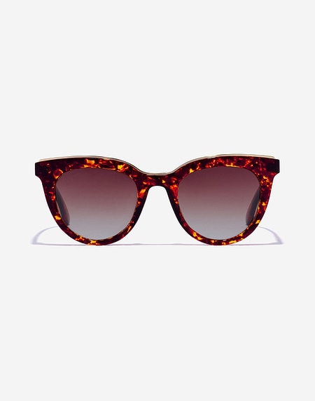 La montura de carey pulida, semitransparente, en color miel, marrón, de este modelo de ojo de gato redondo se complementa con detalles metálicos en tono dorado a lo largo de la línea de las cejas y con lentes polarizadas en marrón degradado.