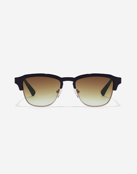 Il frontale superiore e le aste color nero lucido si uniscono agli anelli inferiori dorati e alle lenti sfumate color marrone.