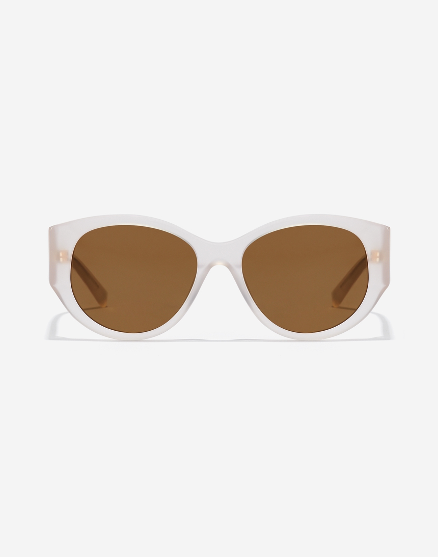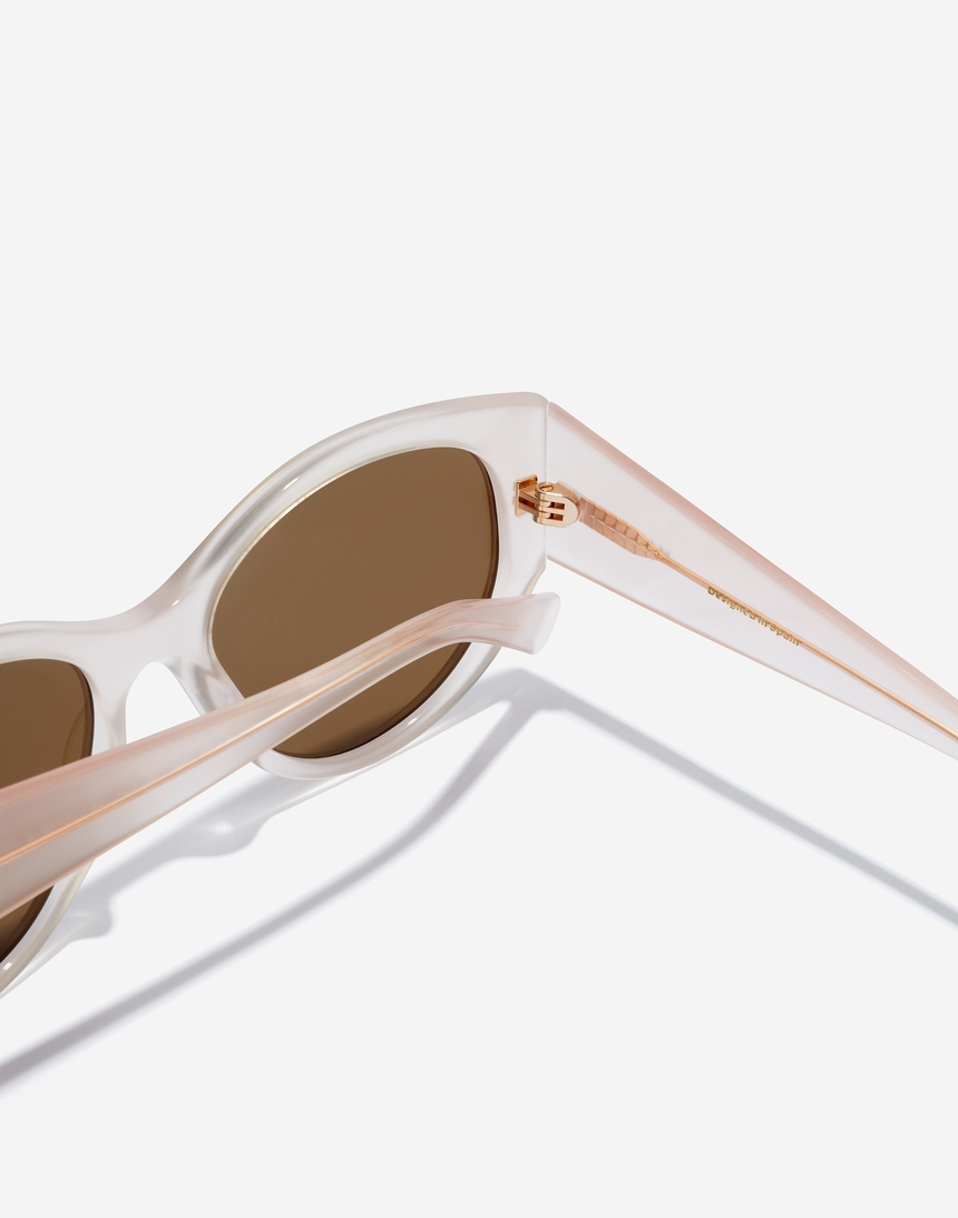 Un diseño oversize redondo en acetato pulido transparente de sutil tono arena pálido y patillas anchas. Lentes color olivo y varilla metálica interior dorada.