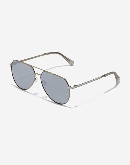 A dusky combination of mirrored chrome and gun metal in this renewed design of the perennial aviator. A pop of white inlayed along the temples results in a contemporary, almost martial effect. Slightly outsized lenses with subtly rounded corners along the top bar, and frosted grey ear tips complete the look.