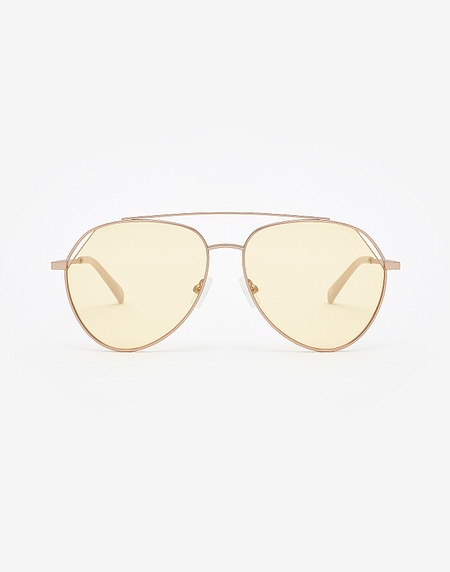 Matt-golden, metallic, aviator-style frame, and tinted yellow lenses with cut away corners.